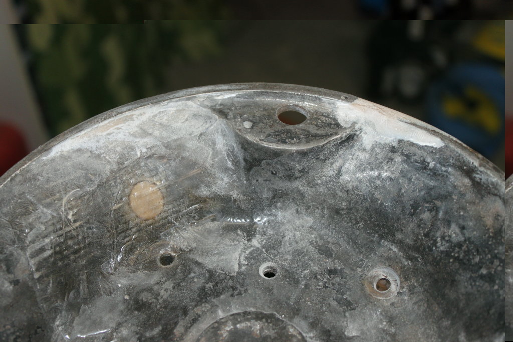 Bei Metall bin ich normalerweise auch Purist und halte nichts vom Kleben. Schweißen, Schrauben, Nieten, so verbindet man Metall. War meine Meinung bis heute Morgen ;-) Uhu Endfest 300 hat gute Arbeit geleistet. Der Deckel klingt sogar wieder, wenn man ihn anstößt. Jetzt kommt aber wieder der Klebeverbindungsmißtrauer durch - ich hab nochmal ne Lage GfK von unten dranlaminiert. Da sich der Kleber etwas zusammengezogen hat, hab ich den Riß im Außenring auch noch gespachtelt. Insgesamt war heute Großkampftag. Das Motorgehäuse hat vertiefte Bohrungen und nachgeschnittene Gewinde. Sie waren wesentlich tiefer als angenommen, auf gut nem Zentimeter kamen Rost und Gammel, dann erst frische Aluspäne. Jetzt weiter. Da ich Harz, Härter, Glasfasermatte und -spachtel sowieso gerade in der Mache hatte, mußten Fuß und Klemmkasten auch dran glauben. Auf der Fußunterseite kam auch ein Glasfasermattenstück zum Zug, darauf gabs dann nach dem Aushärten eine Lage Spachtel. Nebenbei hab ich noch einen Gußlunker am Fußrand mit verspachtelt. Am Klemmkastendeckel hab ich die nicht originale Schutzleiterbohrung verschlossen, ich hab ne (möglicherweise) bessere Idee, ihn anzuklemmen. Dazu später mehr. Ach ja, wie Niklas schon vermutet hat, anscheinend sind an den Stehbolzen der Oberseite Schlitzmuttern. Die kriege ich aber mangels Spezialschraubendreher genauso wenig bewegt, also bleibts...
