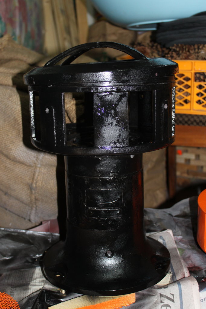 Fuß und oberer Lagerschild sind Grauguß, Motorgehäuse und Stator Alu. Es war sicher effektiver, die fast komplette Sirene nach der Montage einzujauchen als jedes Teil einzeln zu behandeln. Der Klemmkastendeckel, ebenfalls Alu hatte keine Mennigeschicht, der kam anscheinend aus einer anderen "Fertigungslinie" dazu, der komplett anders lackierte Rotor ohnehin.