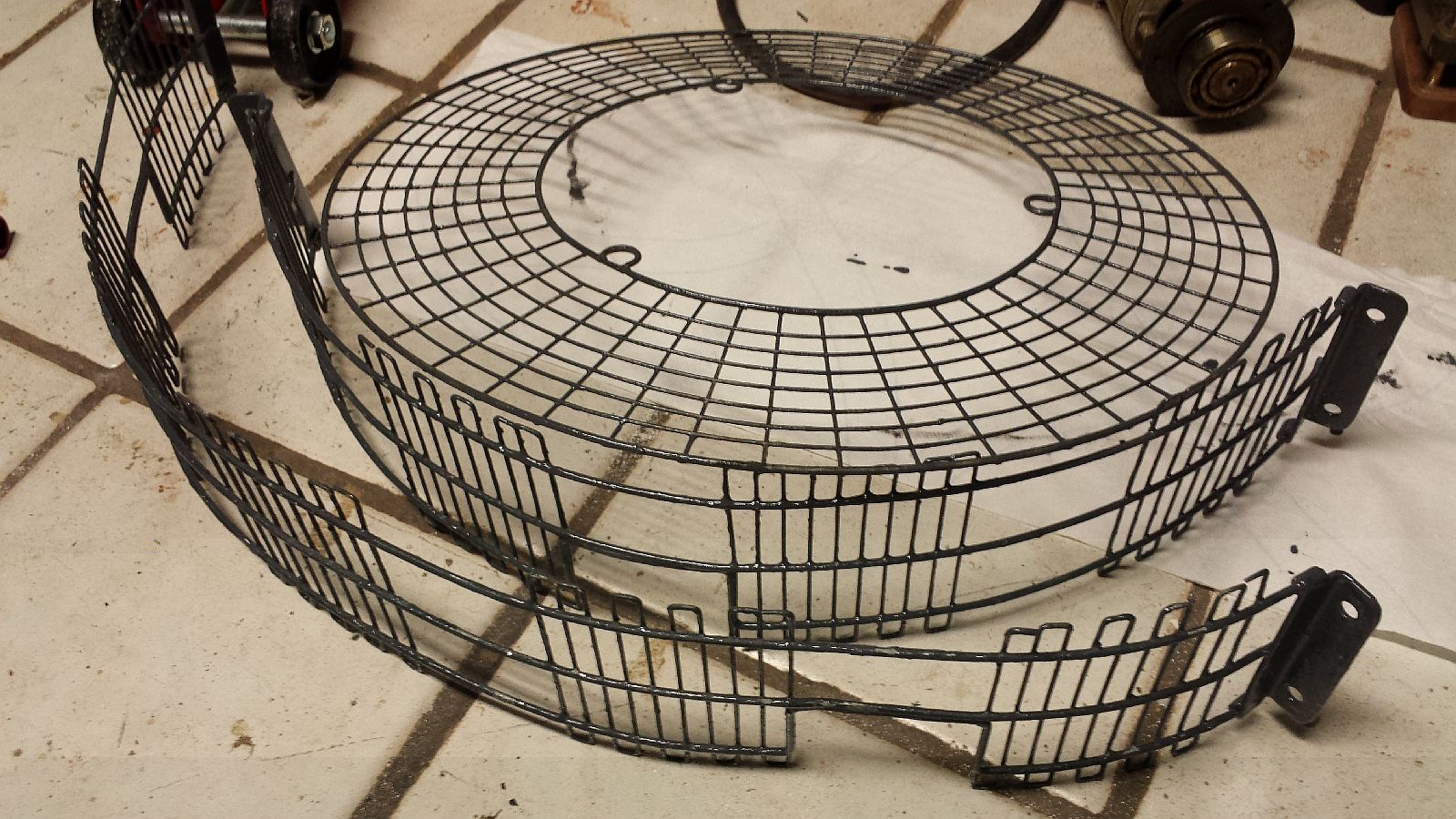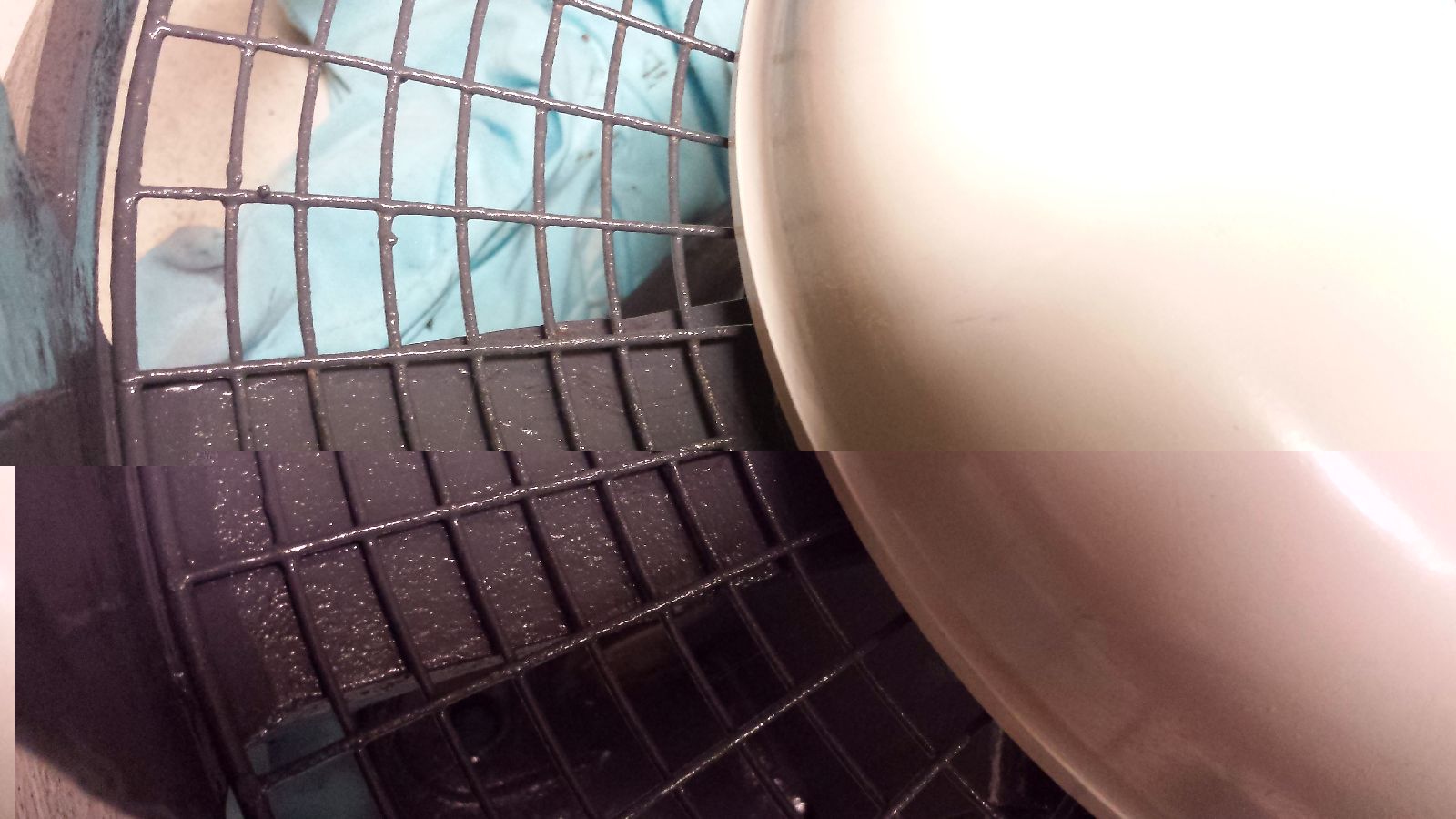 Heute habe ich dann die Schutzgitter schnell mit der Drahtbürste samt Bohrmaschine von Rost und losen Teilen befreit und alles mit Hammerite eingepinselt.