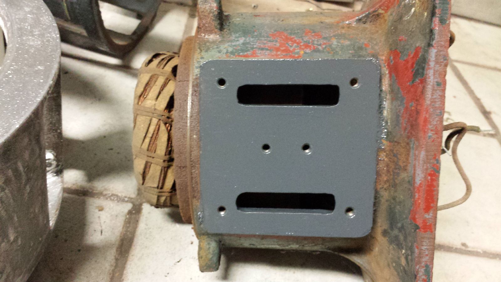 Zudem habe ich die Plane Seite, wo das Klemmbrett aufgeschraubt wird auch in Hamerite Grau gepinselt. Das musste ich zuerst machen weil derzeit die Anschlussdrähte nach unten geführt sind und solange die dort sind kann ich da natürlich nicht arbeiten. Morgen schneide ich dann die neue Dichtung zu, montiere schonmal das Klemmbrett, führe die Drähte wieder nach oben und montiere den Anschlusskasten. Ich habe vor alles im Zusammengebauten Zustand zu lackieren.