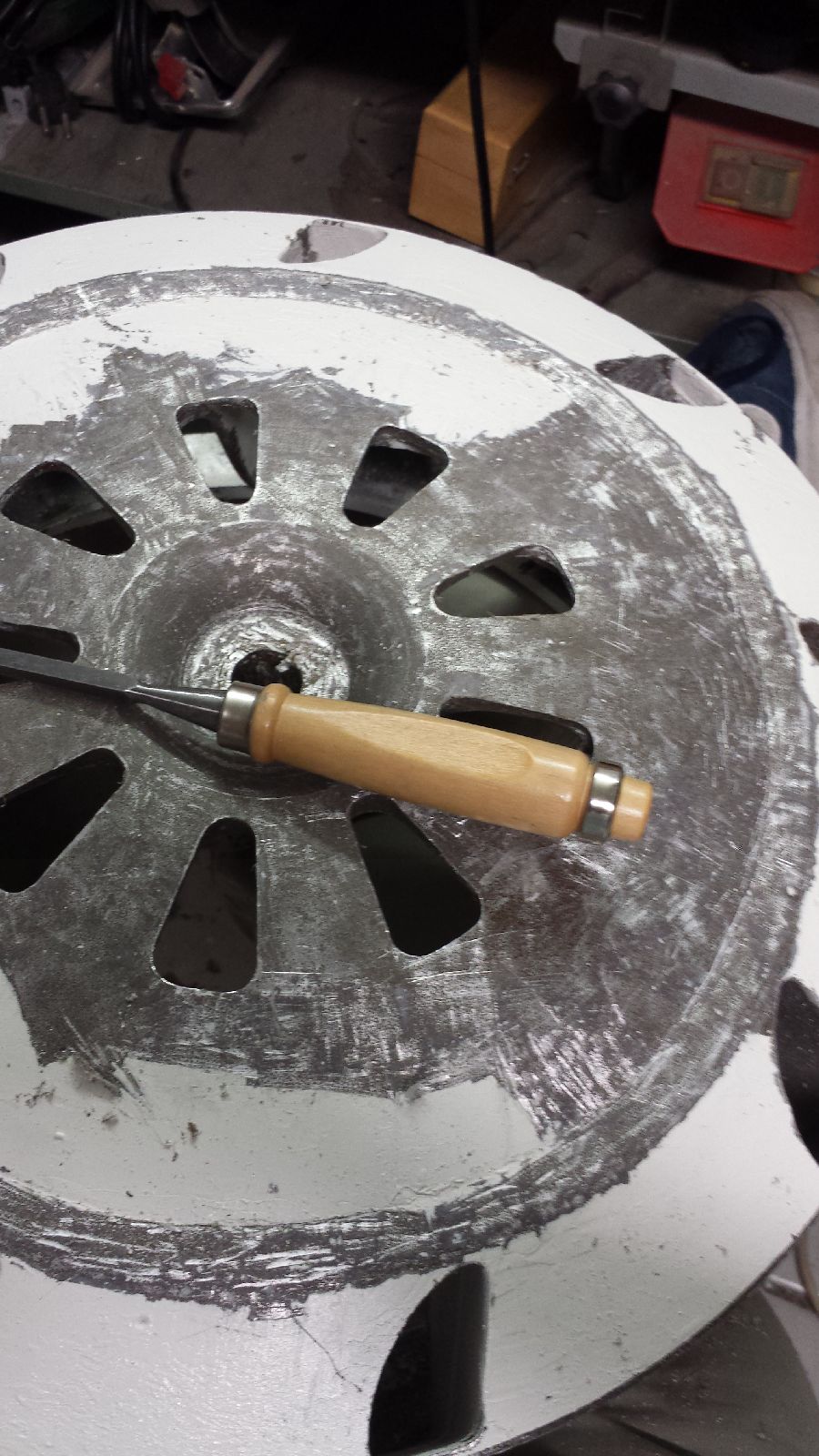 Der Rotor ist immer noch nicht ganz von seiner Beschichtung befreit obwohl ich nun schon mehr als 12Std daran gesessen habe. Da kann man mal sehen, welche Sch**ßarbeit es sein kann diese blöde Beschichtung runter zu holen wenn sie defekt ist. Falls sich das jemals jemand antun will ein guter Tipp von mir: Passt bloß auf eure Pfoten auf! Das Stechbeitel messerscharf sind musste ich schon das eine oder andere mal schmerzhaft erfahren^^
