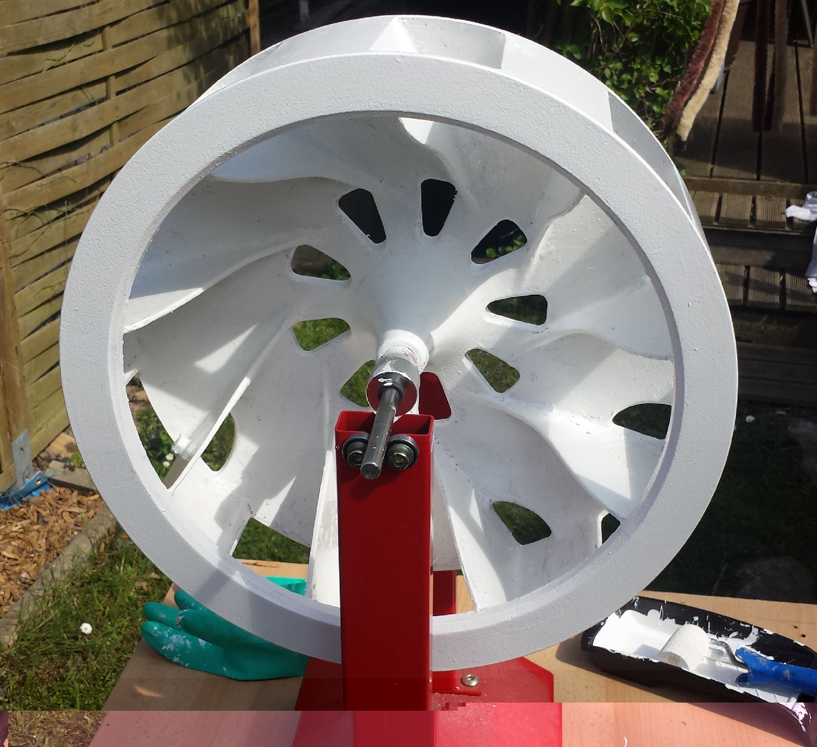 Erst kam der NE-Metall Haftgrund drauf: Da dieser recht schnell trocknete konnte ich die Endlackierung direkt anschliessen lassen: Hier sieht man auch meinen Auswuchtbock für Motorradreifen der sich für das lackieren sehr gut eignet da man so den ganzen Rotor direkt in einem lackieren kann und nicht groß was versaut. Dabei kann man auch wunderbar mit der Rolle arbeiten.