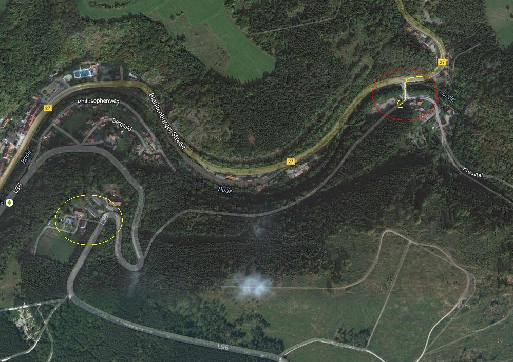 ANREISE, WICHTIG: Die B27 ist frei, die Brücke fertig, allerdings ist jetzt das Straßenstück vor der Hermannshöhle dran. Also: Wer über die B27 anreisen will, muss im Ortsteil Neuwerk aus Richtung Blankenburg links über die Brücke abbiegen. Dort sieht er dann rechts ein Schild für "Ampel", dorthin abbiegen und anstellen. Bei grün folgt eine Abenteuertour über Buckelpiste. Grob eingezeichnet in der Karte "Anreise B27", gelber Pfeil in rotem Kreis, das Zielobjekt ist im gelben Kreis.