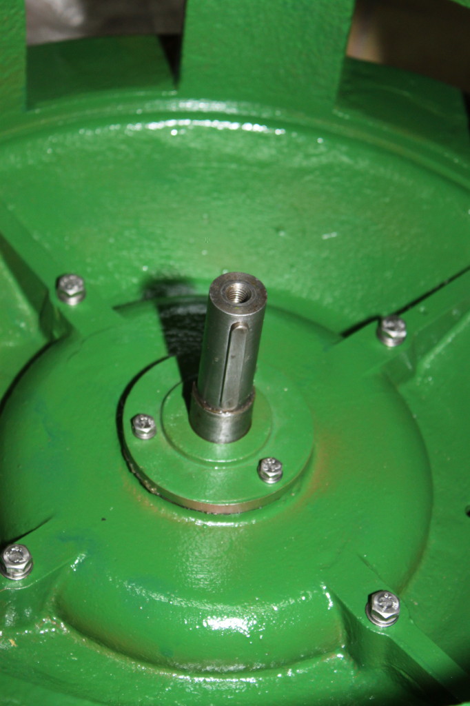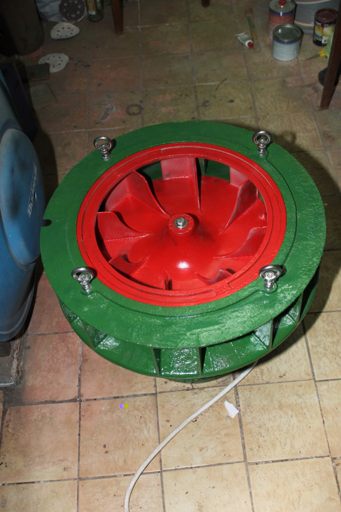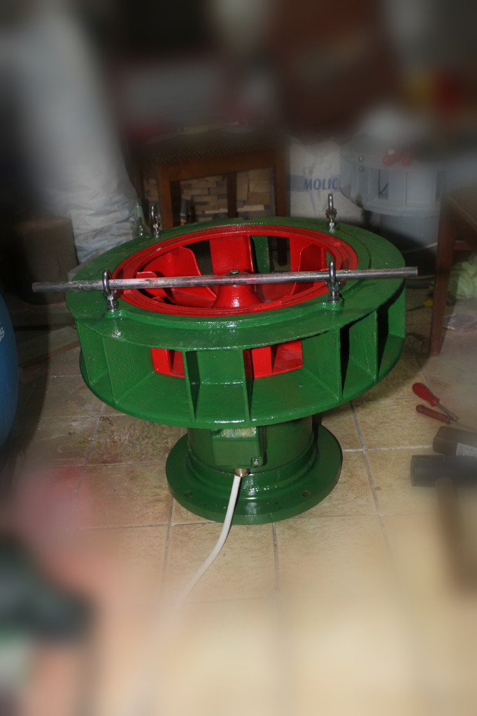 Mein Monsterchen ist fertig! Heute kam eine Schachtel Schrauben und ich war nicht mehr zu bremsen. Den Stator auf den Kopf gedreht, Motorgehäuse drauf, Fuß drauf, Schrauben rein, festziehen. Dann das Ganze runter und richtig herum hinstellen, "toten" Klemmkastendeckel, "scharfen" Klemmkasten und Kabel montieren. Als Nächstes Motorwelle mit oberem Lager in den Stator. Reintüdeln der Motorwelle ins Gehäuse, Stator ausrichten (Kabelnut über "toten" Klemmkasten), Schrauben rein, festziehen. Ein paar Schläge unter Drehen auf die Motorwelle, das untere Lager sitzt. Obere Lagerabdeckung montieren, Probelauf, nanu?! Die Drehrichtung passt schon wieder nicht, gnrrr!!! Aber klar, man sollte den umgepolten Stecker schon vorher zurückdrehen. Drehrichtung passt, HSG auf "Entwarnung" aufgezogen - eine Minute Lagereinlaufen. Passfeder in die Wellennut und Rotor drauf. Der Krepel schleift irgendwo, sowas hasse ich. Nachdem ich alle erkennbaren Überständen am Stator mit Schleifpapier zu Leibe gerückt bin blieb natürlich noch eine Stelle die nicht zu finden war. Hat aber der heiße Probelauf