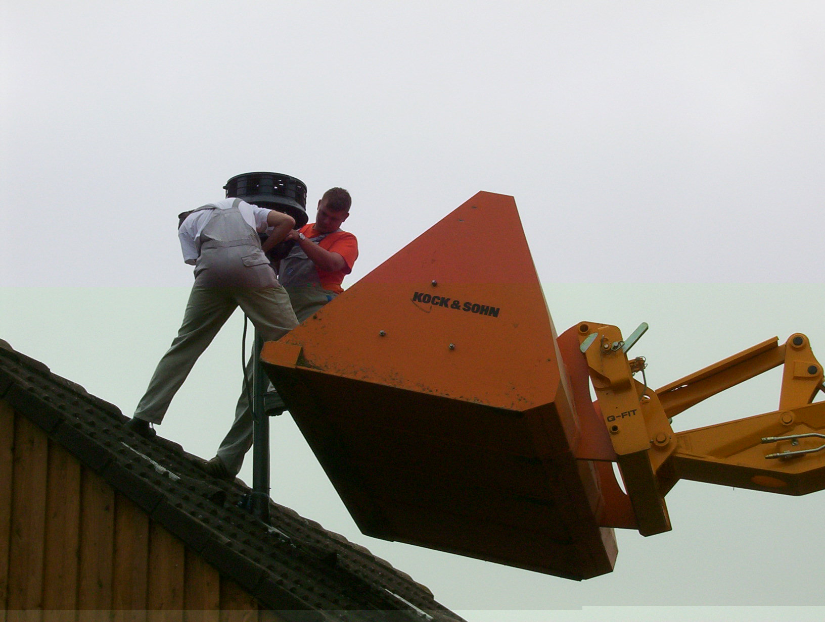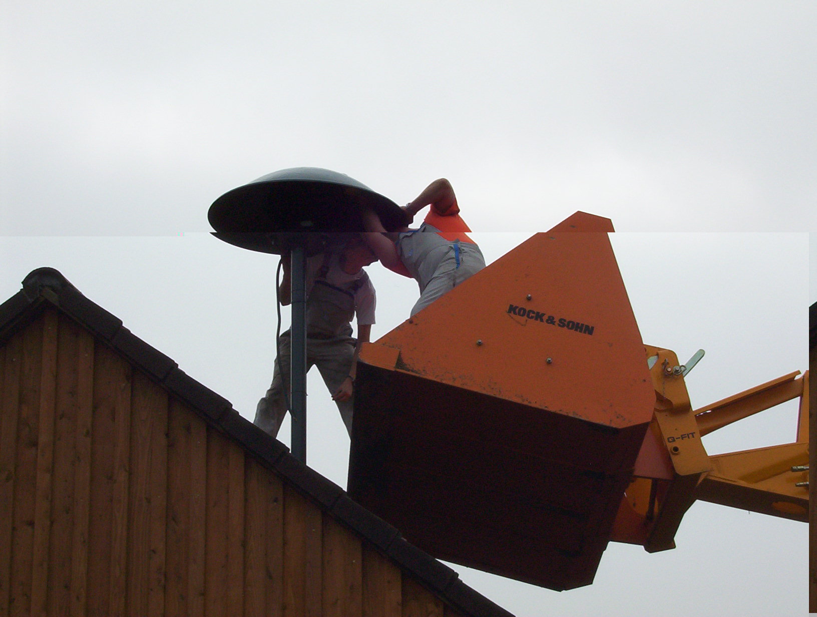 Um etwa 10.30 Uhr haben wir heute morgen angefangen den Mast auf das Dach zu bringen. Mit dem örtlichen Dachdeckermeister ging das ganz schnell!