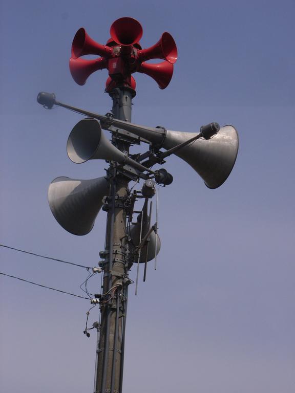 Ich kann zwar kein japanisch, aber mein "Übersetzer" erwähnte was von einer Sirene. Habe mal das Japanische Kauderwelsch in Google-Bildersuche reinkopiert und das ist das Ergebnis. Jede Menge Bilder mit Türme und Maste wo ein Fass- oder Eimerähnlicher Gegenstand dranhängt, wo ein Kabel heraus kommt.