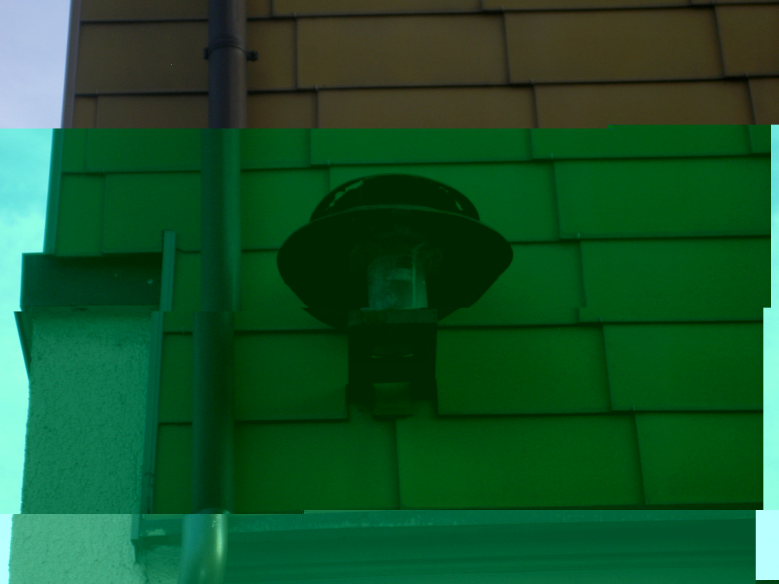 Auf einem abgelegenen Hof eine weitere sehr grosse alte Sirene (warum da?) Kaliber Siemens mit ansatzweise drei erkennbaren sehr stark korridierten Dächern.