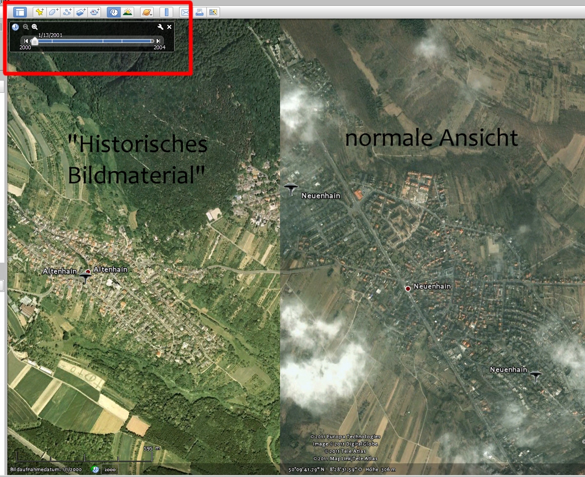 @FunkerVogth: Du hast in den neueren Versionen von Google Earth die Möglichkeit, Bilder verschiedenen Datums auszuwählen. Probier das doch mal.