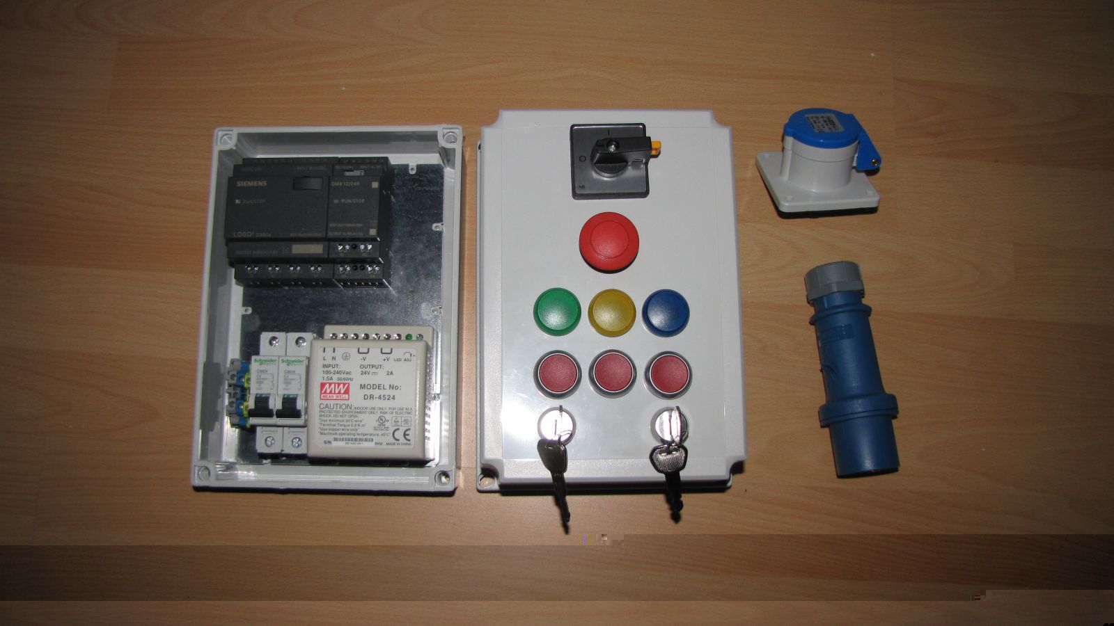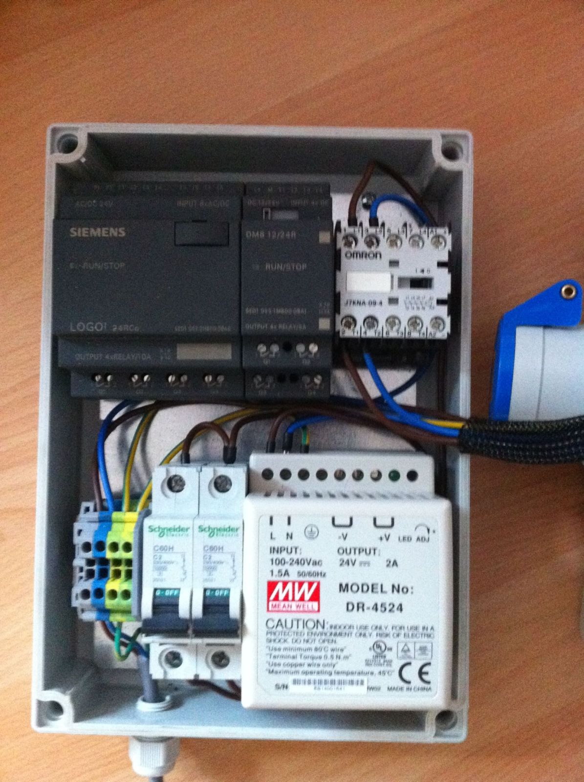 So heute hab ich den Steuerstromteil die Taster und Schalter verdrahtet. Für die Lämpchen hat die Litze nicht gereicht muss ich noch neue holen. Bevor ihr mich wegen der schwarzen Litze die zum Schütz geht aufhängt, die ist nur zum testen. Die LOGO Schaltung funktioniert, hab ich testen können. Die Blaue Leuchte zeig den zustand des Schütz an.