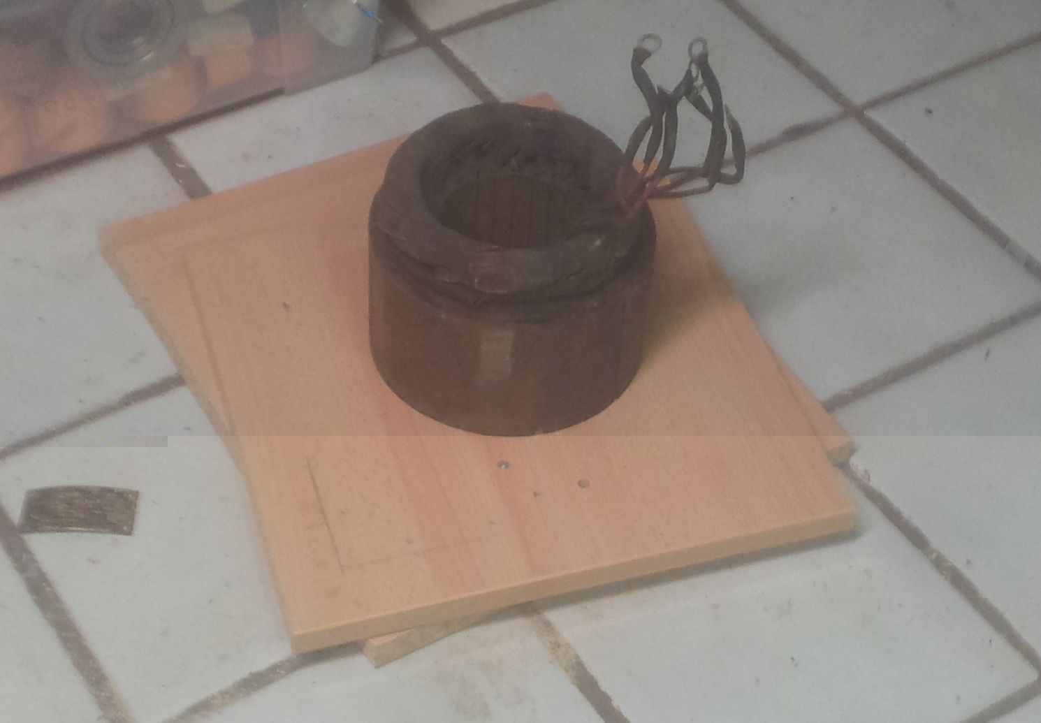 Zum "komisch aussehenden Brett": Habe einfach in eine alte Tischplatte 2 Löcher mit einem Durchmesser von ca. 175mm geschnitten und die beiden teile aneinander geschraubt sodass die wicklung ohne Schaden an den drähten eingeschlagen werden konnte.