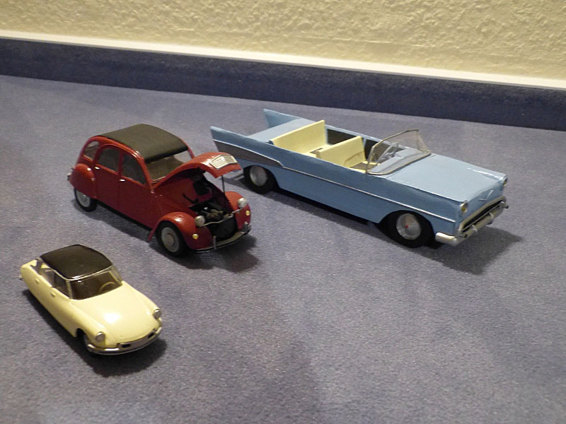 Hinten ein Eigenbau von mir, ein Chevrolet Bel air von 1957 aus Karton, davor eine Ente und vorne eine Citroen DS.