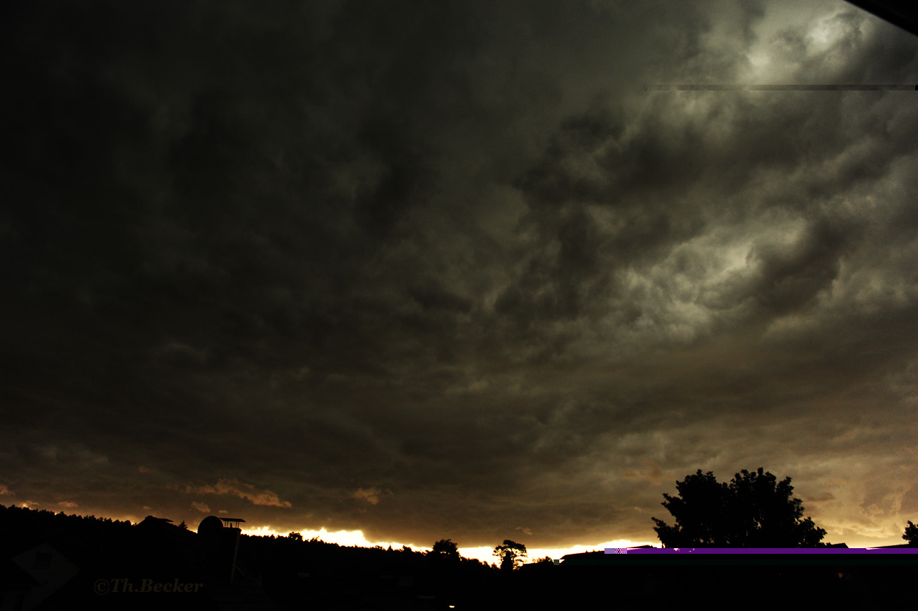 Hier noch zwei Fotos aus meiner Dachwohnung. Einmal Richtung Westen mit Blick auf die anziehende Front. Das zweite Bild ist Richtung Osten aufgenommen. Die ersten Wolken sind schon drüber gezogen und ganz im Osten ist noch der letzte Sonnenschein zu erahnen. War schon unheimlich. Ich hatte auch Angst, dass sich daraus ein Tornado entwickeln könnte. So extrem selten ist das ja leider auch nicht mehr.
