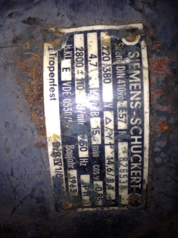 Zur Geschichte: Ich habe diese Sirene zusammen mit einer Roland Sirenenbau E57 am 12.10.13 aus Waldau in der Gemeinde Vohenstrauß (Bayern) geholt. Beide Sirenen wurden mir als Defekt verkauft da eine auf dem Feuerwehrhaus montiert war und durchbrannte und der Zustand der anderen unklar war. Die Roland E57 war angeblich eingelagerte Reserve die man nun aber nicht mehr benötige, da nach dem abrauchen der E57 eine Sonnenburg SES 600 aufgebaut wurde. Dann als ich beide Sirenen bei mir hatte, habe ich unseren Firefighter3 aus Brühl den Rotor der Siemens gegeben, da er Probleme mit der Beschichtung hatte und der Siemens Rotor noch eloxiert war. Zu dem Zeitpunkt ging ich von einem Defekt der Siemens aus.