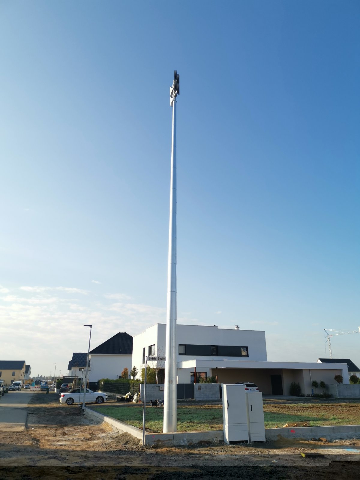 Im Baugebiet im Westen der Stadt, an der Kreuzung Sophie-Scholl-Straße und Gyönker Straße, steht seit kurzem eine ECI 1200 als Mastanlage.